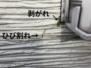 外壁の塗膜がひび割れや剥がれを起こしていました!劣化を起こしている面積は広くはないですが、やっぱり外観が損なわれますねΣ( ̄ロ ̄lll)